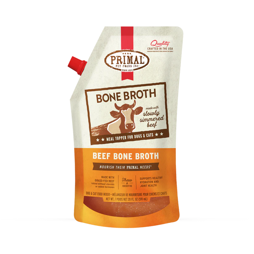 Bone Broth is a wholesome addition to any feeding regimen. When served on its own, added to commercial pet food, or along with any complete, balanced Primal Formula, Bone Broth adds necessary moisture and beneficial nutrients into your pet’s diet. With key benefits including digestion and liver support, hydration and moisture, joint health, and more, supplementing with Bone Broth is an easy way to keep your pet hydrated and healthy. Primal Bone Broth is appropriate for dogs and cats at all stages of life.