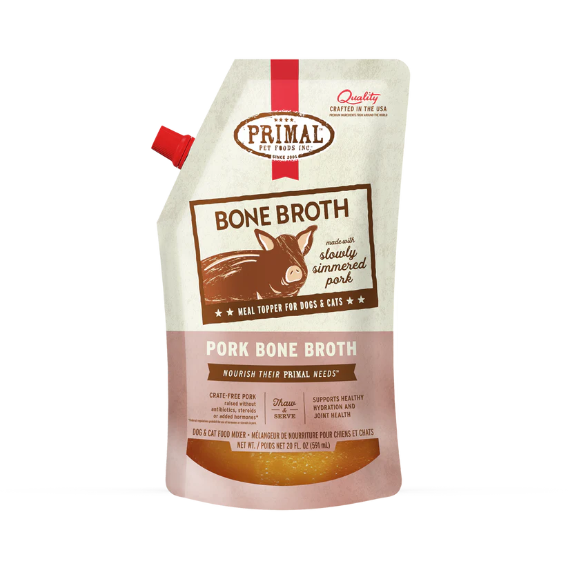 Bone Broth is a wholesome addition to any feeding regimen. When served on its own, added to commercial pet food, or along with any complete, balanced Primal Formula, Bone Broth adds necessary moisture and beneficial nutrients into your pet’s diet. With key benefits including digestion and liver support, hydration and moisture, joint health, and more, supplementing with Bone Broth is an easy way to keep your pet hydrated and healthy. Primal Bone Broth is appropriate for dogs and cats at all stages of life.