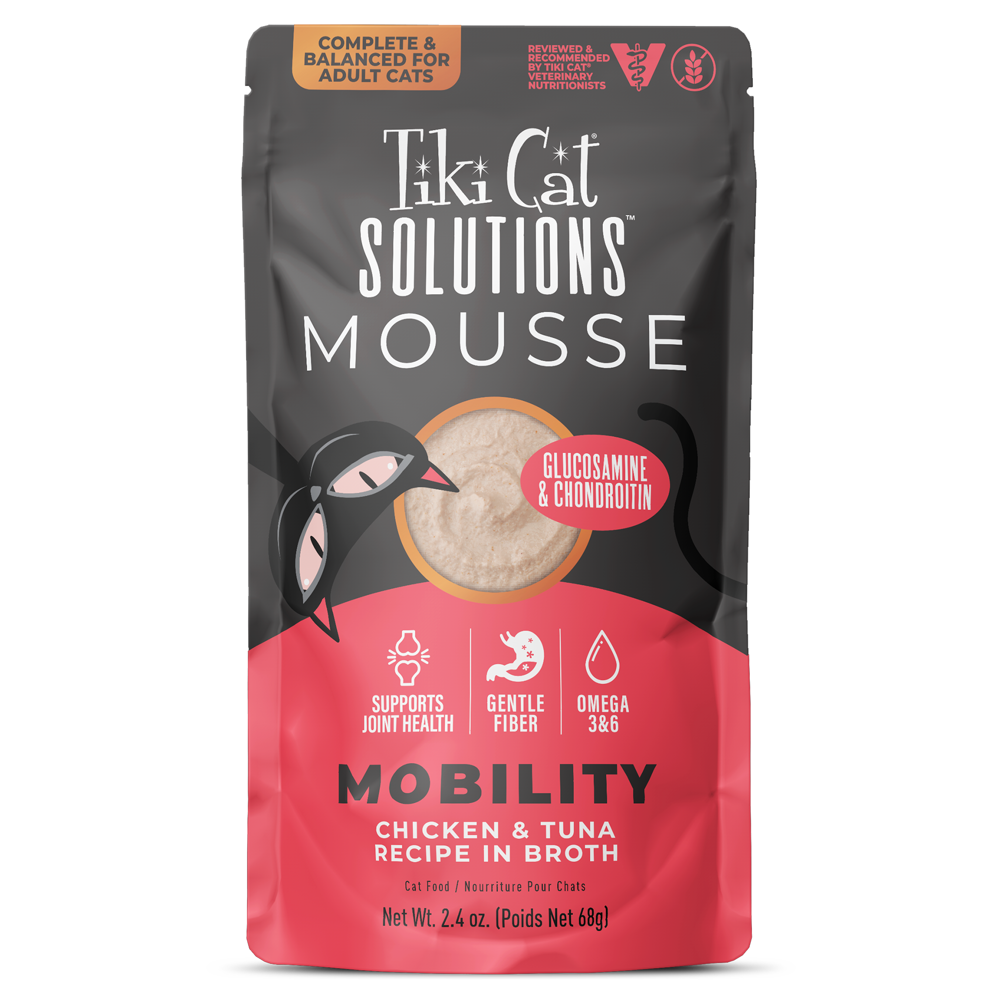 Supports Joint Health. Tiki Cat® Solutions™ Mobility Topper is a protein-rich gravy made with glucosamine and chondroitin to support joint health. Adds moisture and benefits to dry kibble.